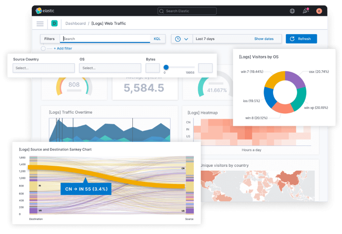Elasticsearch 为搜寻与分析引擎,其扩展性可以在任何环境下快速搜索,并即时提供分析结果。Logstash 则是最先接触日志资料的系统,为一资料采集管道,再复杂的资料源都能快速转换、传送至Elasticsearch。最后资料交由Kibana 进行视觉化,客制化的仪表板与图表提供绝佳的视觉体验,也有告警机制(alerting) 能针对特定条件发出告警。